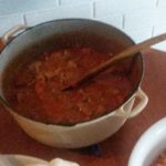 Ha så i tomater, tomatpuré og vann. Rør godt sammen og la det koke opp. Ha på lokk og la det småkoke i 1- 1,5 timer. Rør om av og til.